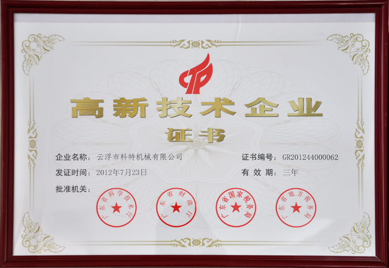 云浮市科特機械有限公司位于廣東省云浮市都楊高新區、佛山(云浮)產業轉移工業園,占地面積40000多平方米,是一家專業生產石材機械裝備的高新技術企業。